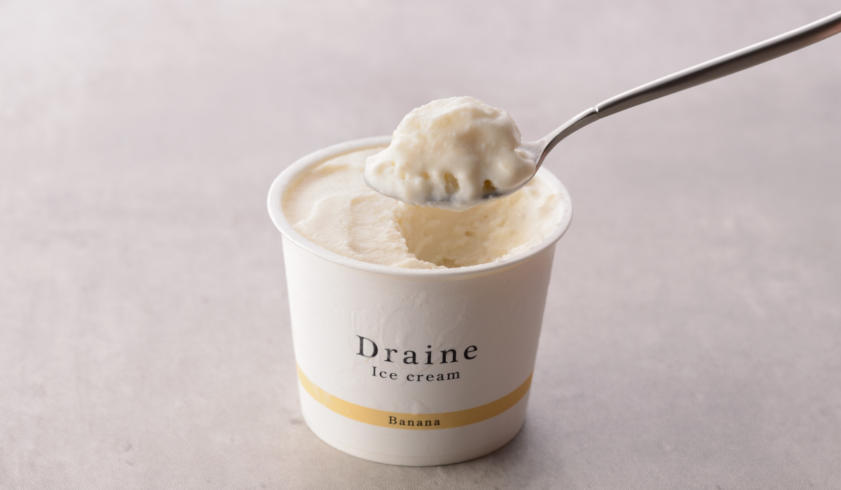 【Draineアイスクリーム(2種6個セット)】バナナとミルクの2種のフレーバー。口に入れた瞬間、贅沢にとろける感覚をご堪能いただけます。国産の生乳と生クリームを使用し、ベストな口どけに仕上げています。